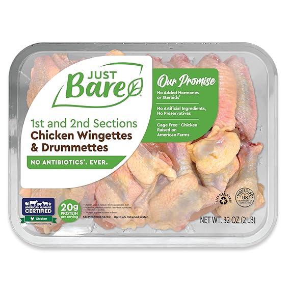 Just Bare® wingettes and drumettes come from chickens fed a wholesome vegetable and grain diet, supporting humane farming practices certified by American Humane. These wings are free from gluten, antibiotics, hormones, and steroids, making them a wholesome option for any meal.