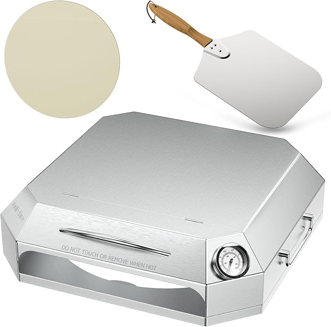 An integrated thermometer provides precision by monitoring temperatures up to 800°F, helping you maintain optimal cooking heat. The kit also includes a lightweight 12 aluminum pizza peel with a foldable wooden handle, allowing for easy handling and storage. Its compact, portable design fits perfectly on most grills and is simple to set up for spontaneous pizza nights.